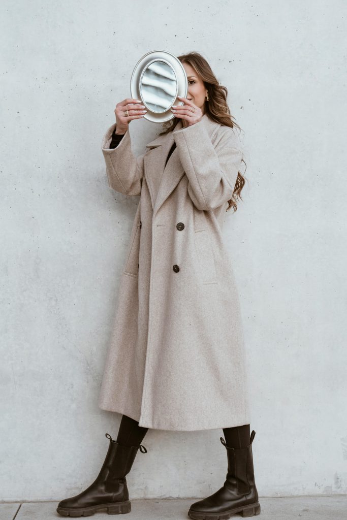 A fitted turtleneck, tailored coat, and loafers. Simple, clean and easy to move in. A silk hair tie or statement earrings give it just enough personality.