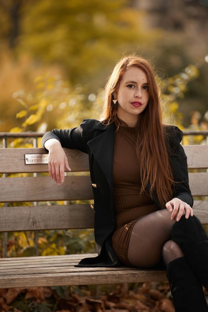 A flowy midi dress with a soft cardigan and tall boots creates a feminine but warm vibe. A felt hat adds a subtle autumn touch that ties everything together.